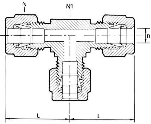 Raccord union en té en inox 316L permettant de connecter 3 tubes de même diamètre "D" entre eux