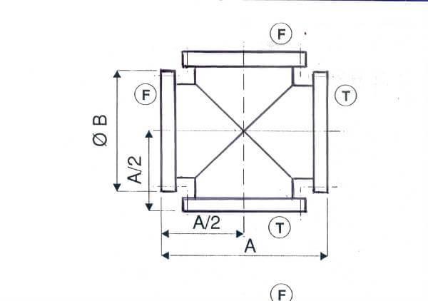 Croix égale ISO CF inox à 90° avec 1 brides fixes et 3 brides tournantes à trous lisses. Brides à couteau pour joint métallique